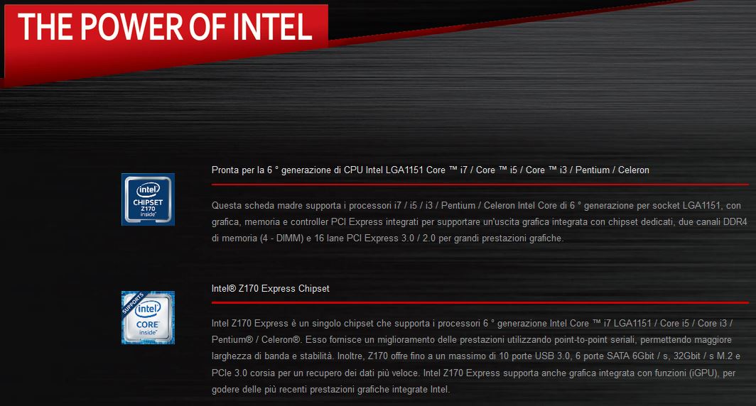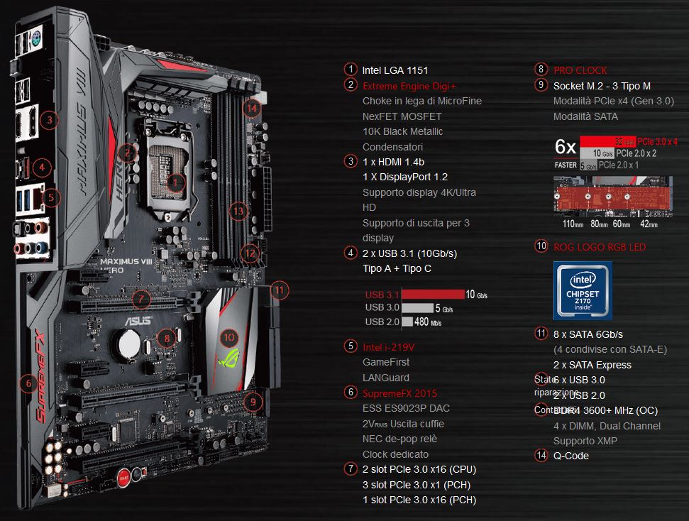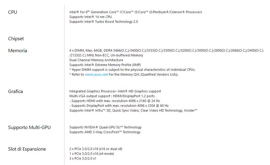 Il cuore della scheda Maximus VIII Hero è il PCH (Platform Controller Hub) Z170. La presenza del socket LGA1151 la garantisce con i processori della 6° generazione Intel® Core i7 / Core i5 / Core i3 / Pentium e Celeron. A seguire le specifiche tecniche che è possibile trovare anche sul sito del costruttore.
