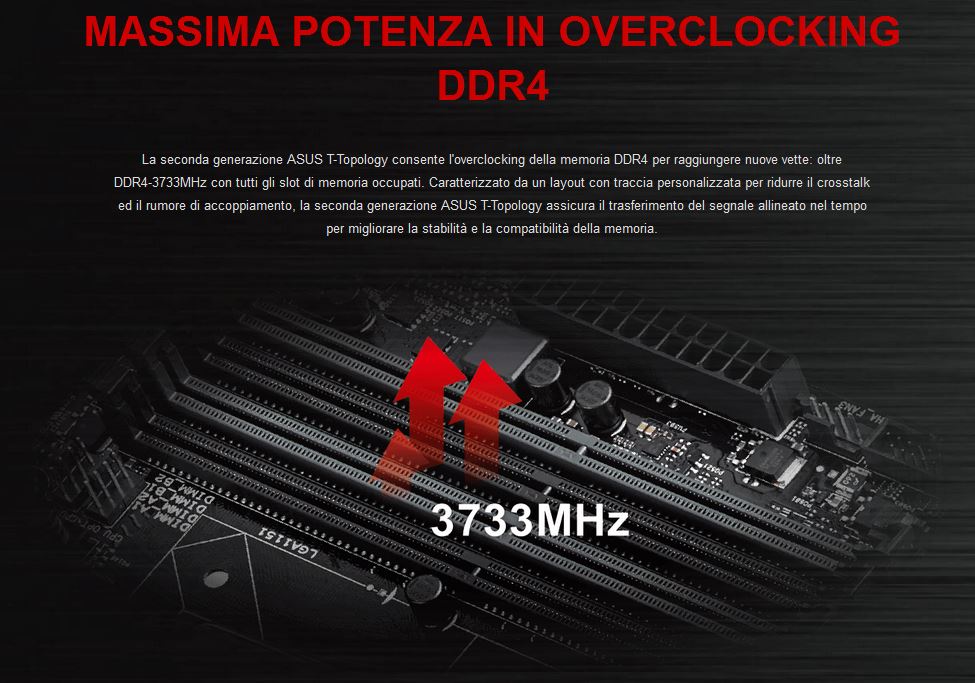 Superare i 3733 MHz con le DDR4 pone problemi di stabilità del segnale specie se si opera con tutti e 4 gli slot occupati. Asus ha risolto il problema con la seconda generazione della tecnologia identificata con il termine T-Topology. Essa tiene allineato nel tempo il segnale durante il trasferimento migliorando la stabilità della piattaforma e la compatibilità con molteplici brand di memorie.
