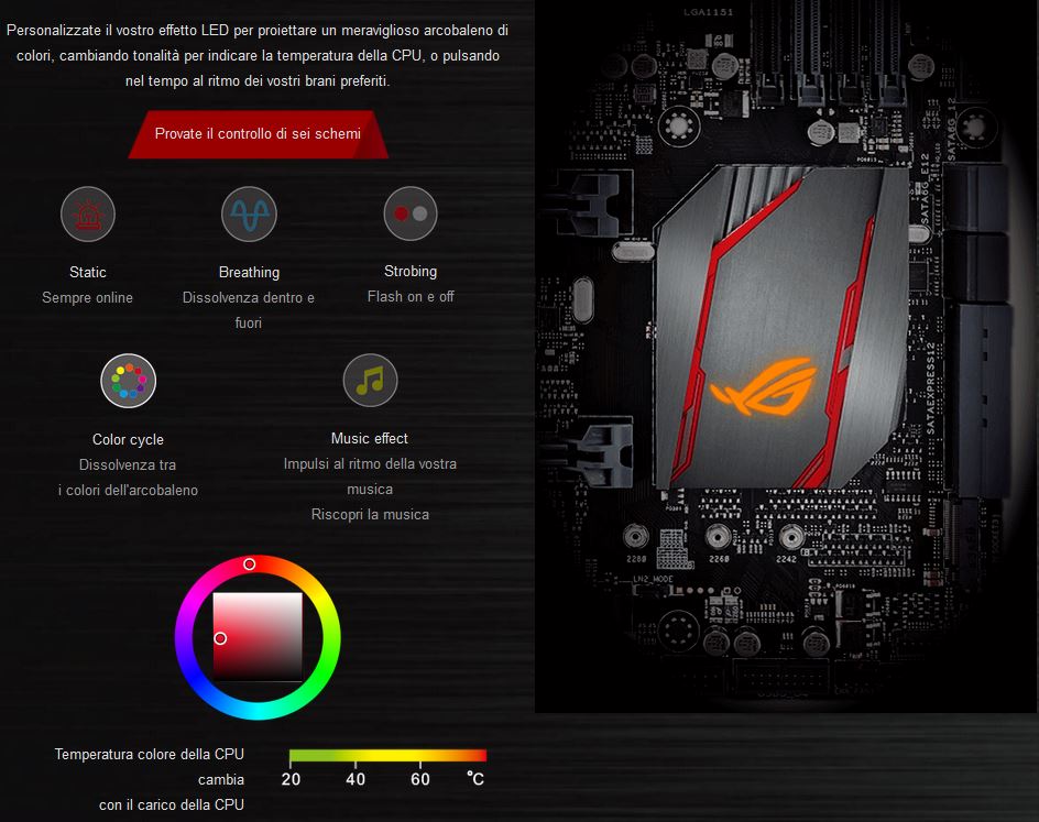 Sono sempre di più i modder o gli utenti esigenti che adottano case finestrati perché, si sa, l’occhio vuole la sua parte. E su questo ha lavorato Asus per offrire un aiuto per personalizzare la propria piattaforma tramite un LED RGB integrato nel dissipatore del chipset. Non solo, grazie agli stati di colore è possibile tenere monitorata anche la temperatura della CPU.