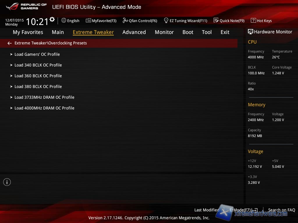 La sezione più interessante per gli Overclockers e gli Hardcore Gamers è la Extreme Tweaker, in quanto include tutti quei parametri sui quali agire per personalizzare ed overcloccare (aumentare) la frequenza di lavoro dei singoli componenti iniziando dai preset che permettono di avere delle basi di partenza in Overclock del Bclk o della RAM. Vi abbiamo mostrato gli screen impostando i valori massimi che è possibile selezionare. Come vedete sono valori molto alti che solo con una scheda madre di classe ROG è possibile avere. Ovviamente devono essere utilizzati con molta cautela in relazione al tipo di raffreddamento adottato ed al tipo di overclock desiderato.